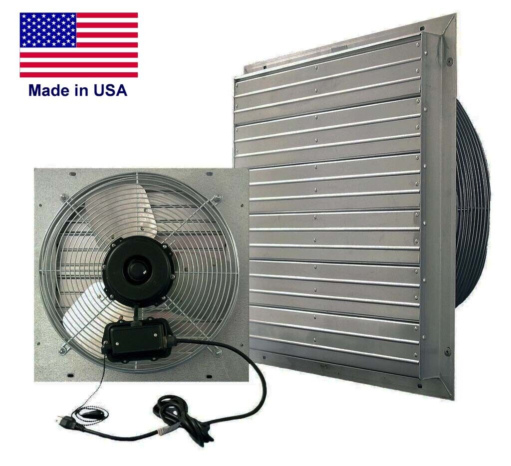 Features: Pre-wired - Arrives assembled - Perfect for greenhouses, warehouses, etc - 9 ft power cord - 115 Volts - Aluminum Shutter and Blades - Aluminum shutter includes tie bar to reduce flapping in the wind - Chrome guard allows for easy cleaning - Wall Mounted Made in the USA