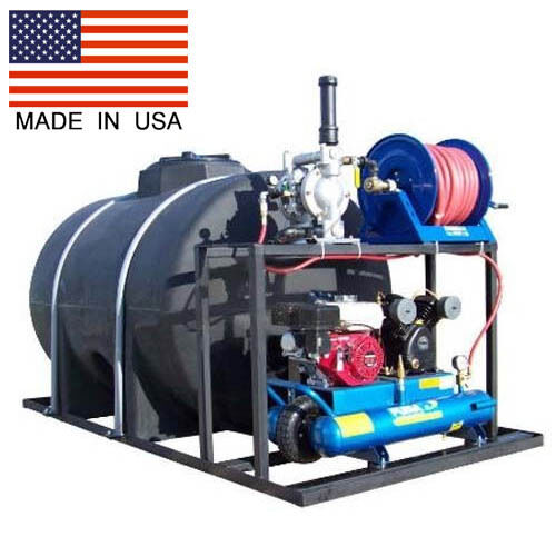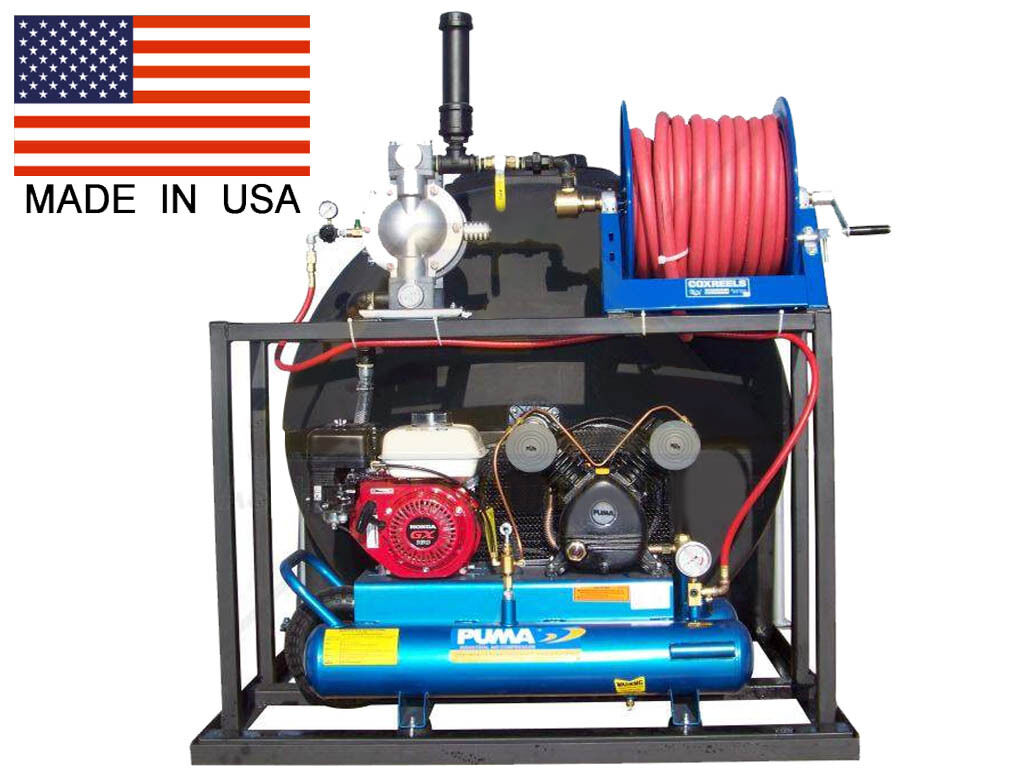The system is manually operated and features a Honda Puma 8-gallon air system with a manual start. It generates pressure up to 150 PSI at a rate of 20 CFM. The pump is a 1" dual-diaphragm Yamada model, requiring no lubrication for operation.